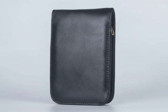 This faux vegan friendly leather pen slip holds 12 pens in elasticated loops with 6 on each side and a velvet-type folding divider between the two sides. It will comfortably hold and protect your pens from dents and scratches, even large diameter pens.