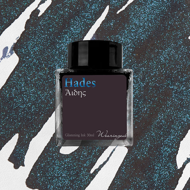 Inspired by the Greek god of the underworld and death, Hades embodies retrained beauty with a deep black reminiscent of the underworld. This shimmering ink is littered with frozen blue glitter which gives it an ethereal look to capture the essence of the afterlife.