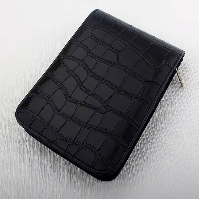 This faux vegan friendly leather pen slip holds 12 pens in elasticated loops with 6 on each side and a velvet-type folding divider between the two sides. It will comfortably hold and protect your pens from dents and scratches, even large diameter pens.