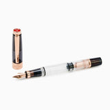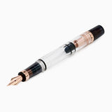 The TWSBI Diamond 580 Fountain Pen in Smoke/Rose Gold II is a clear demonstrator piston filled fountain pen featuring an aluminium machined grip section, connector and piston rod, making the fountain pen robust. It measures 14.2cm in length capped (17.5cm posted) and comes presented in a smart, modern clear box, alongside a little vial of silicone grease to lubricate the piston over time. Also included is an instruction sheet and small spanner to take the piston mechanism from the barrel for lubrication. The nib, ink feed and grip section can also be taken apart for cleaning and maintenance - it is not advised unless necessary, but it can be done.