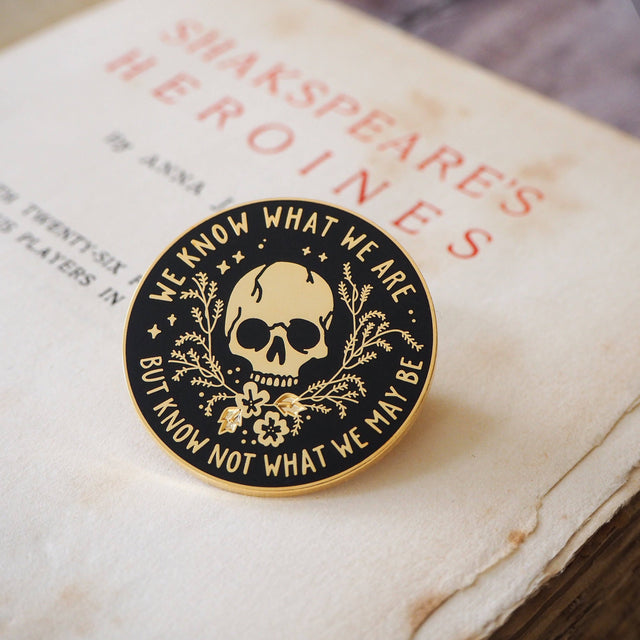 Part of our Shakespeare's Heroines collection, this black and gold enamel pin features an intricate skull design and bears the Ophelia quote: "...we know what we are, but know not what we may be." (Hamlet, Act IV Scene V).