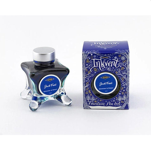 Diamine Jack Frost is a blue sheening, shading and shimmering fountain pen ink, from Diamine’s 2019 Blue Edition Advent Calendar, which featured 25 brand new colours. Jack Frost ticks all of the boxes - its navy blue base is enhanced with a fantastic blue shimmer and heavy pink sheen, while shading is present even with a finer nib width. It comes beautifully presented in a uniquely shaped 50ml glass bottle.