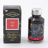Diamine Red Sky is a red shimmering fountain pen ink. A mid range red, the ink has significant levels of shading, which is further added to by an eye-catching blue-pink shimmer. It comes well presented in a 50ml glass bottle.