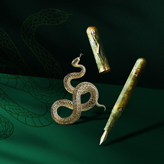 Nahvalur (previously known as Narwhal) Pen of the Year Limited Edition in Snake is a time limited fountain pen commemorating the Lunar Year of the Snake. Crafted in the standard Nautilus shape, the Pen of the Year: Snake is made of a green, gold and silver resin which evokes images of the animal's glistening scales.