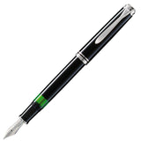 The Pelikan M805 fountain pen in all-black features high-quality resin with rhodium trim and 18c gold nib with full rhodium decoration (available in a number of widths.) The small ink view window towards the nib end is coloured transparent green but becomes black when the pen is filled with ink.