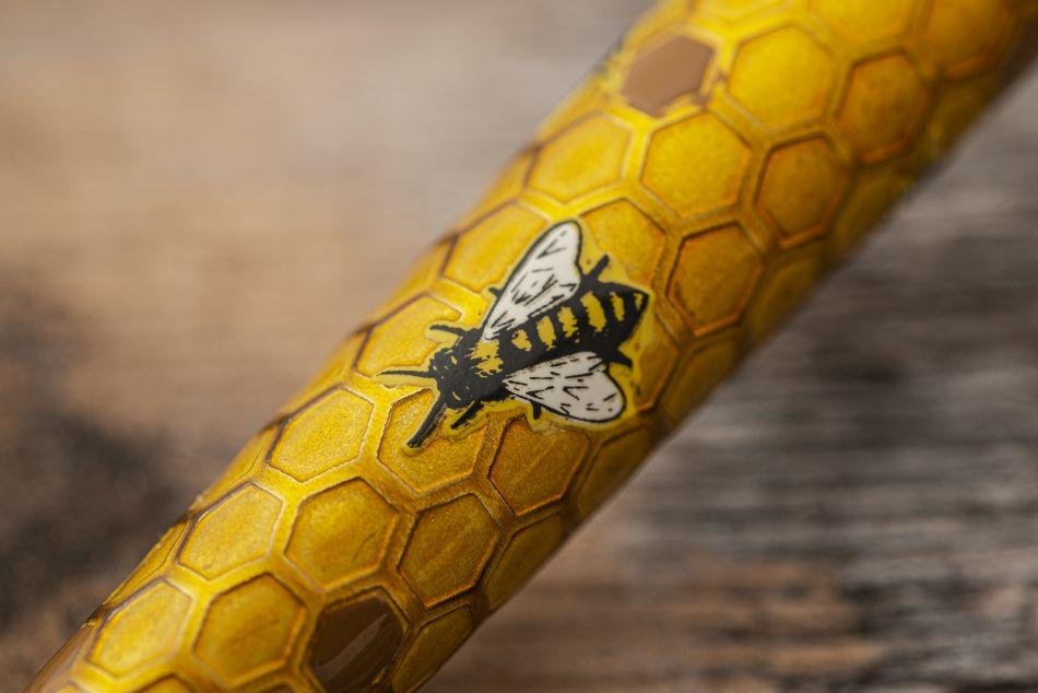 The Retro 51 Tornado Deluxe is a twist action, retractable ballpoint pen with a knurled cap, antique copper accents, features an acid-etched honeycomb texture with printed honey bees. It has antique copper trim.