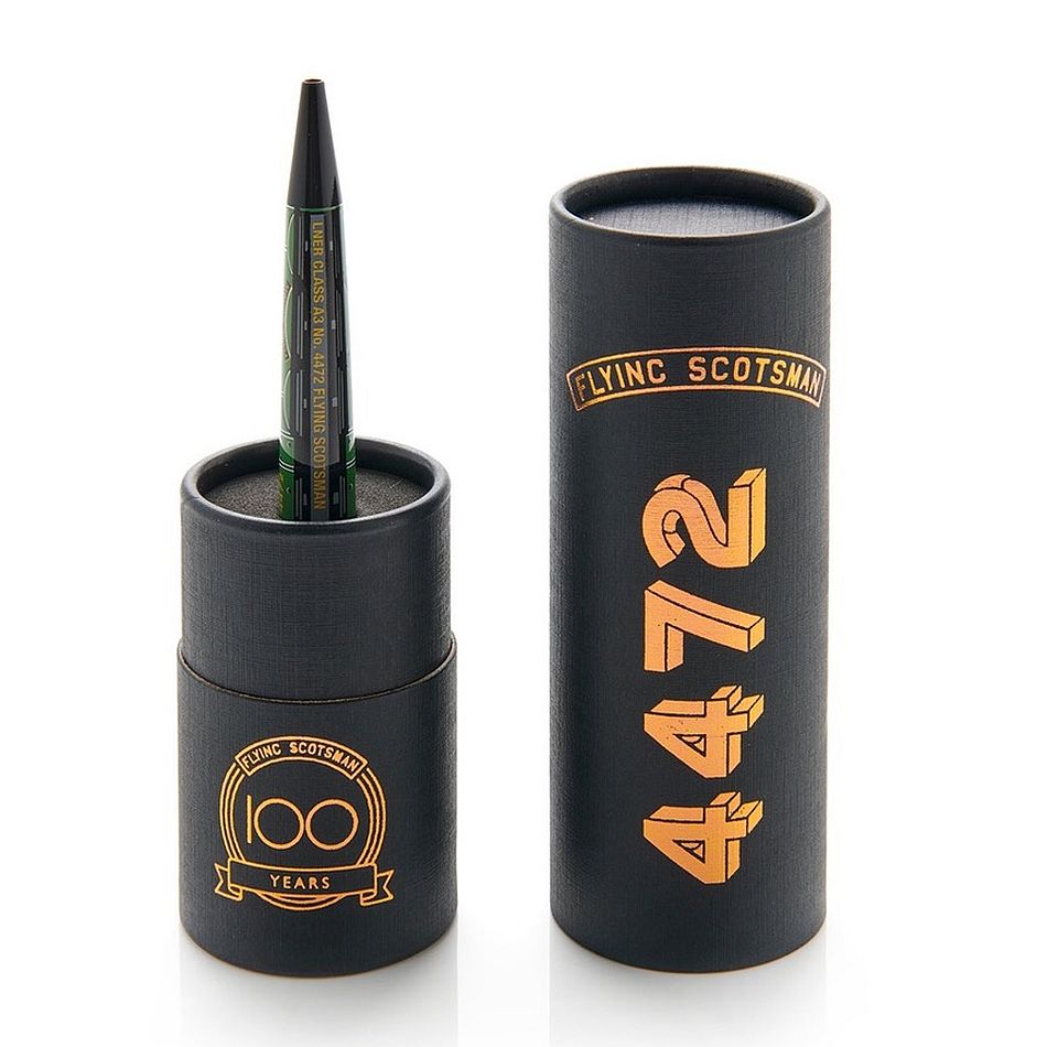 The first Steam Engine to record a speed in excess of 100mph. This record beating locomotive was also famous for offering a non stop service of 392 miles from London to Edinburgh, the capital of Scotland. It utilised a larger tender carrying an extra tonne of coal and a 'secret' corridor to allow the crew to change without stopping. It adopted the name "Flying Scotsman" due to the non-stop, record journey time of only 7 hours and 20 min down from the usual 10 and a half hours.  Designed by American pen company Retro 51, this 'National Railway Museum' Flying Scotsman Numbered Edition Pen is a beautiful writing instrument that celebrates the centenary of the beloved steam engine. Each pen is individually numbered with its very own printed number on the side. Write in style today.