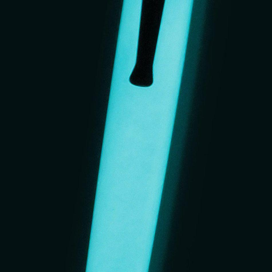 Although simple in design, this rollerball is far from silent. The Chaplin Tornado’s matte white finish over a stainless-steel body with black trim would be enough to draw the eye of any pen fan. But this pen becomes a star at night with its blue luminescent glow!