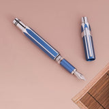 The TWSBI Precision Fountain Pen in Gemini Blue featuring a piston-filling mechanism with a very smooth action, it has an aluminium barrel and grip with stainless steel trim and pocket clip.