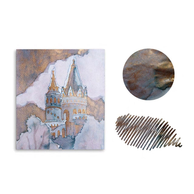 “Clouds of Grey” is a grey-toned ink with brown and purple nuances, flecked with a gold shimmer.