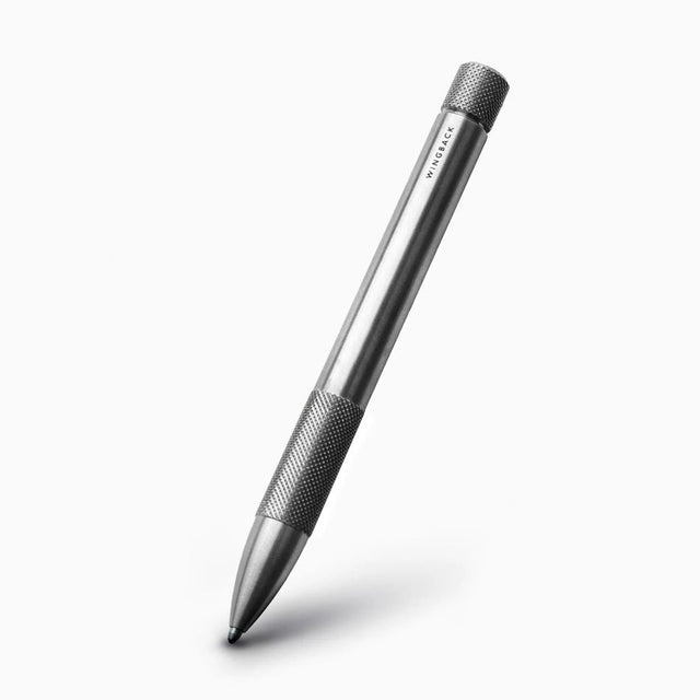Reassuringly weighty in the hand and designed to limit hand fatigue when writing with a knurled grip and large diameter, this precision-crafted aerospace grade metal pen will be your treasured possession.  Its knurled crown is contoured so that with a single twist of one hand you can lock the writing point into place. It is machine-turned, and manufactured in England. It fits the Fisher Space Pen® PR4 cartridge which we include, or the Schmidt Megaline 4889.